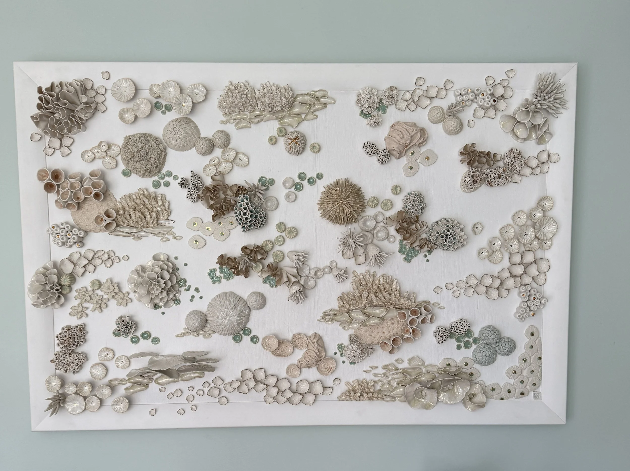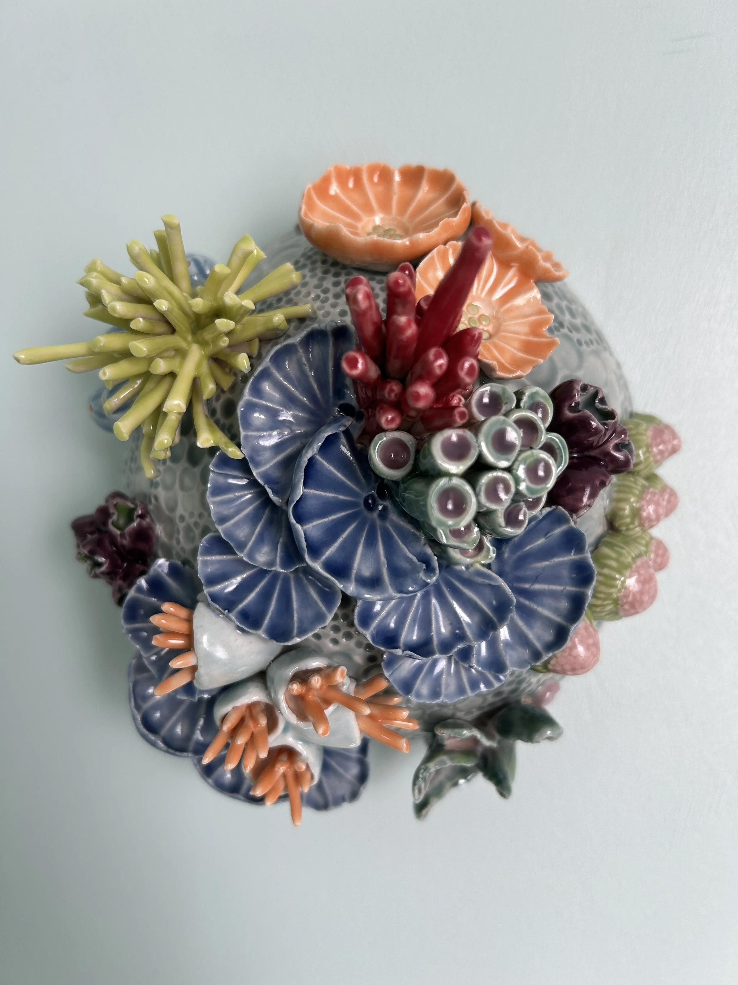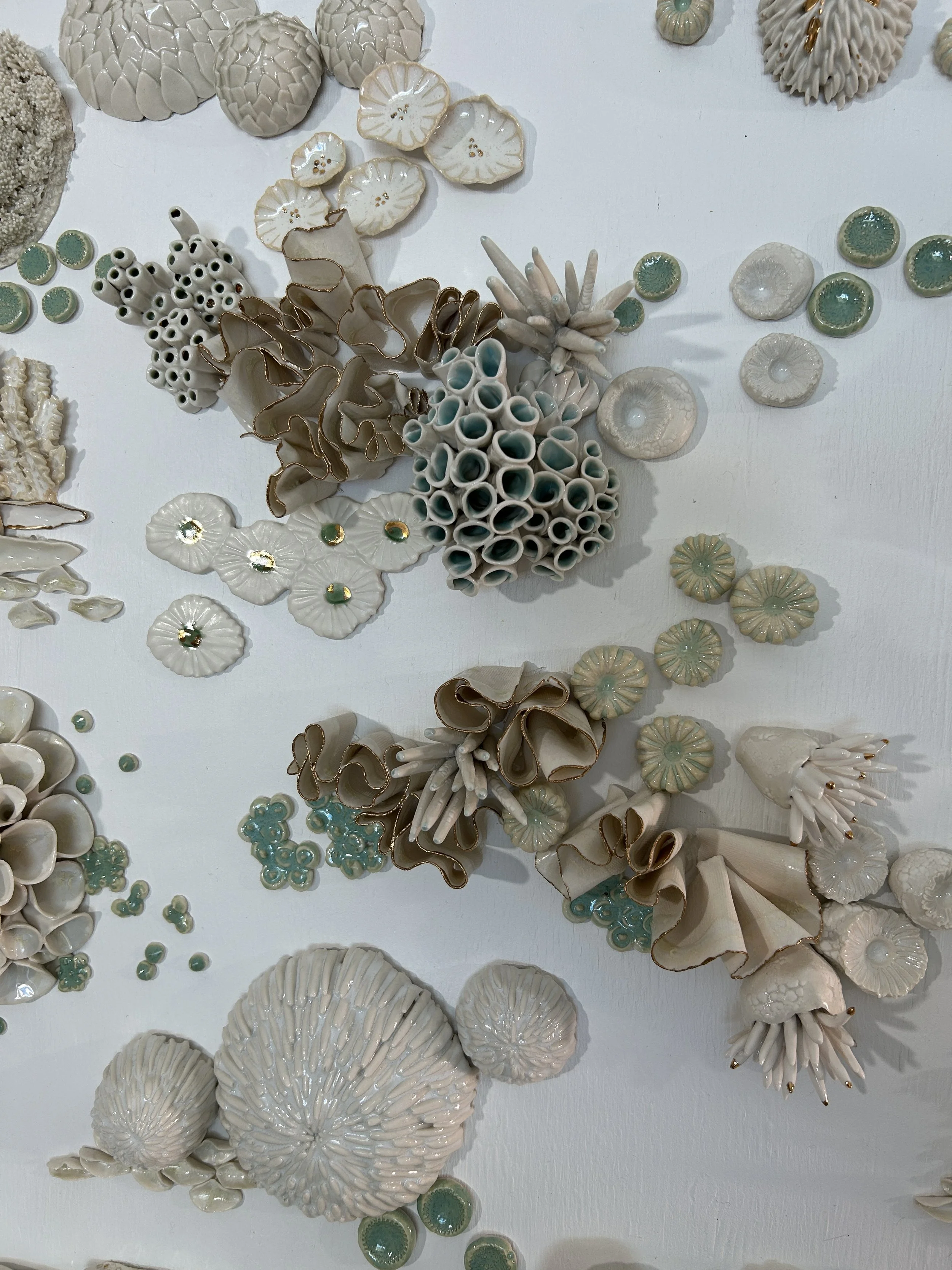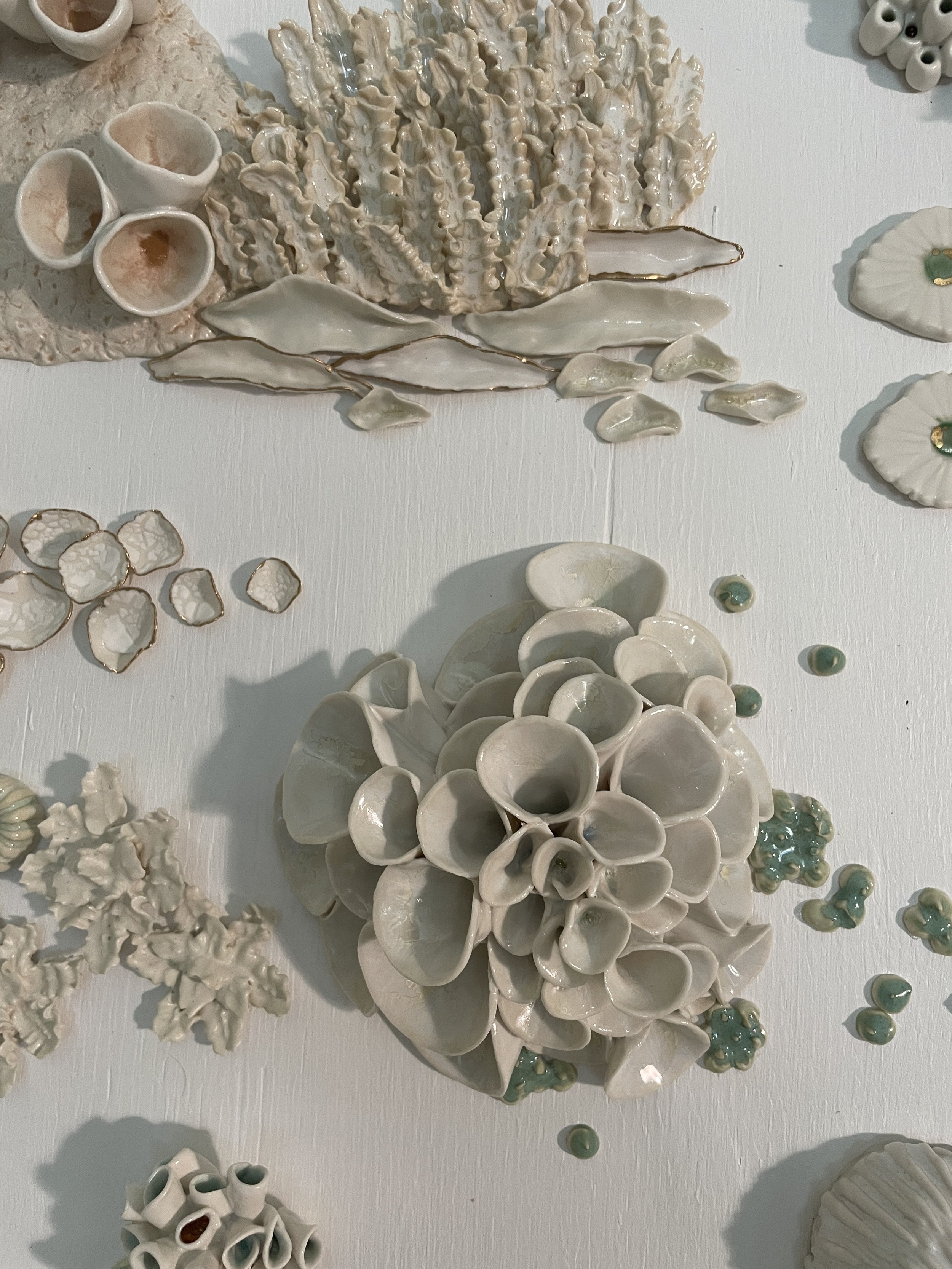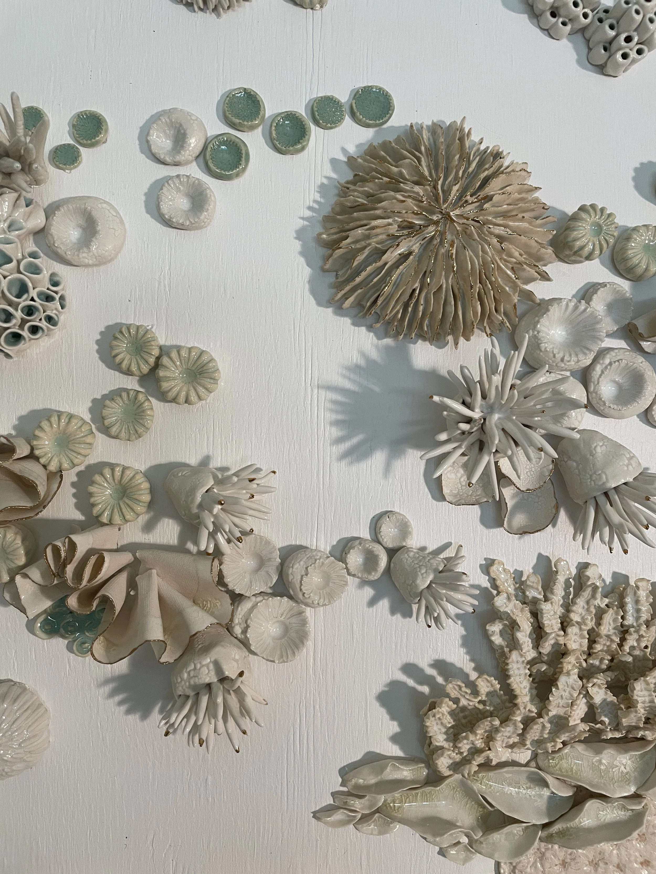 I learnt various techniques after taking a workshop with the queen of coral installations, Courtney Mattison when she had an exhibition at MOCA in 2016. I make teeny tiny porcelain corals only 1 inch to 14 inches in circumference and recently I have made them so that they can hang on the wall. Each piece has an initial firing, then hand glazed 3 times to highlight all the textures before its final firing. Occasionally, I will apply 22K gold and this is then fired a third time.