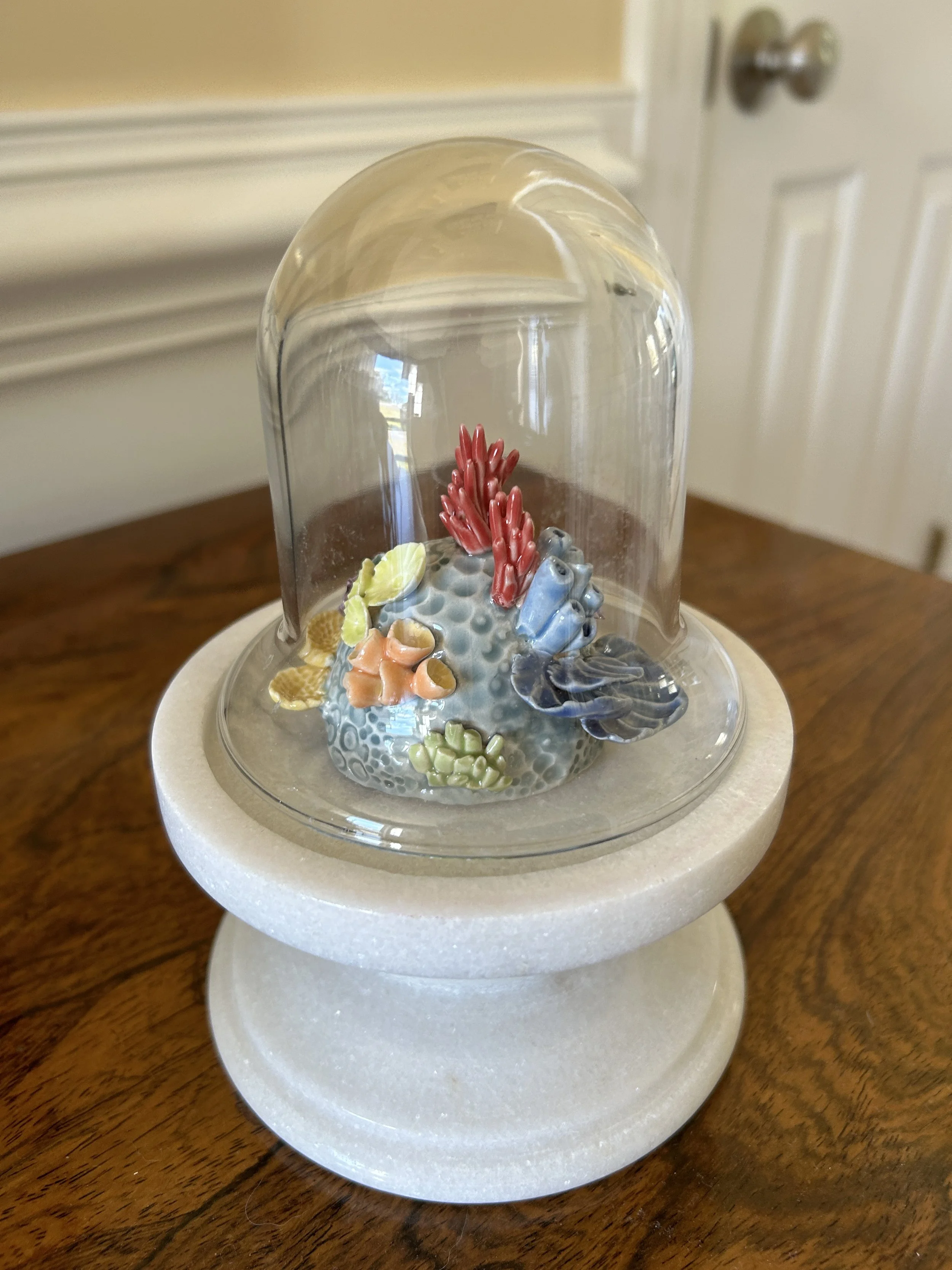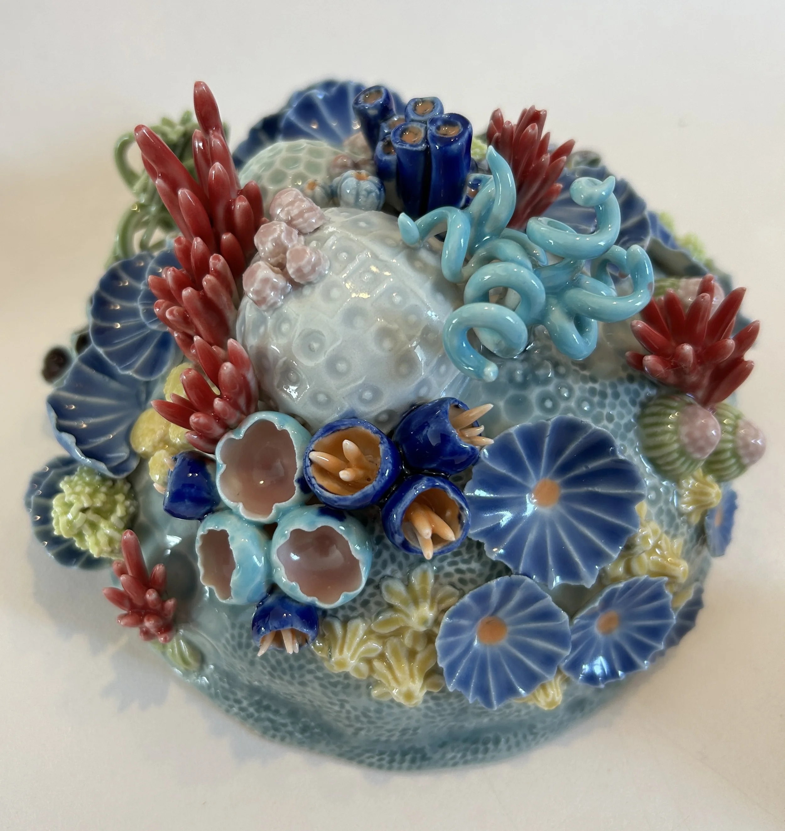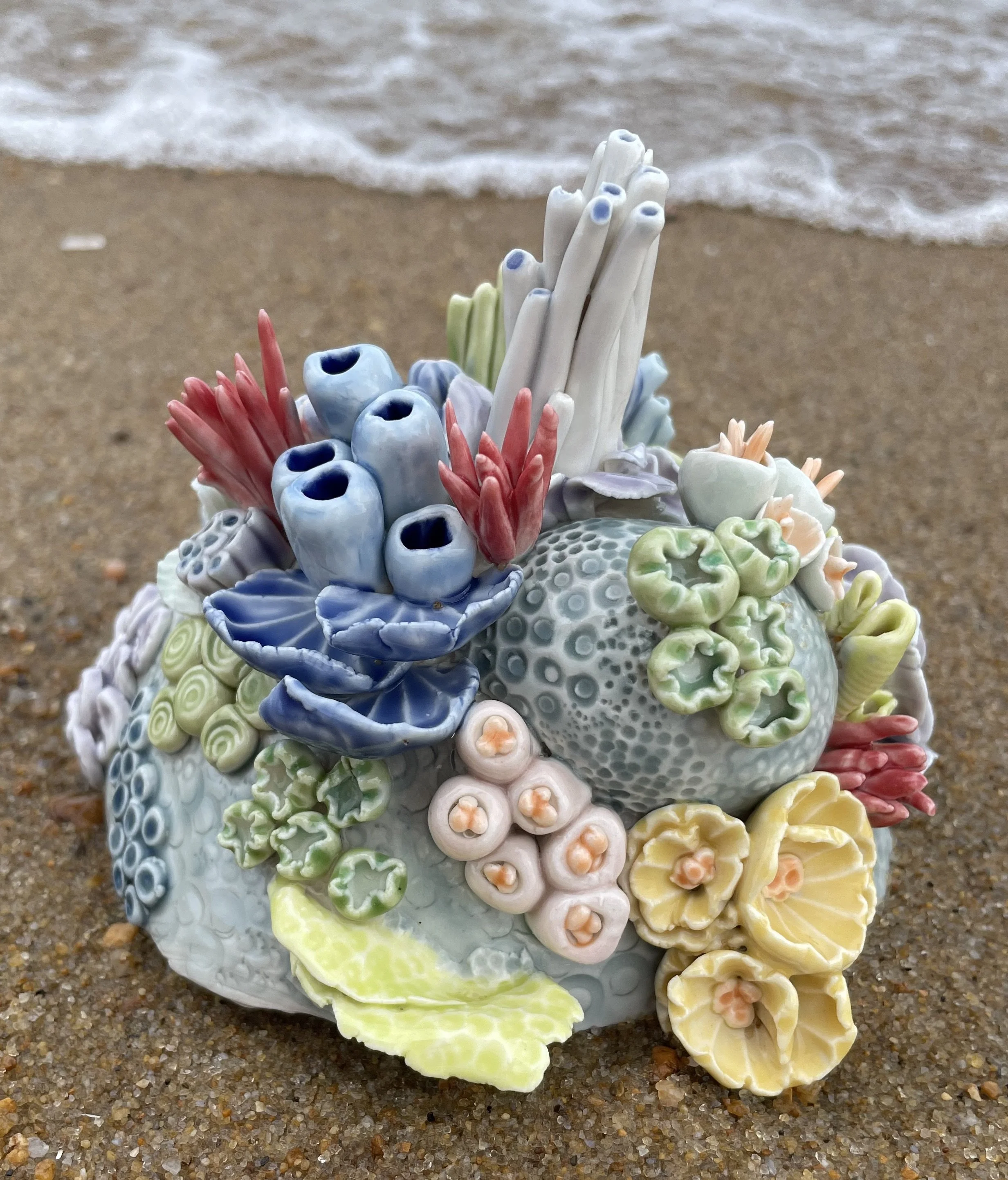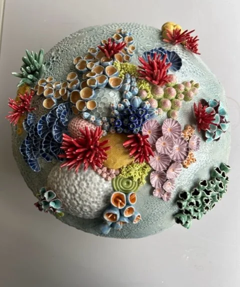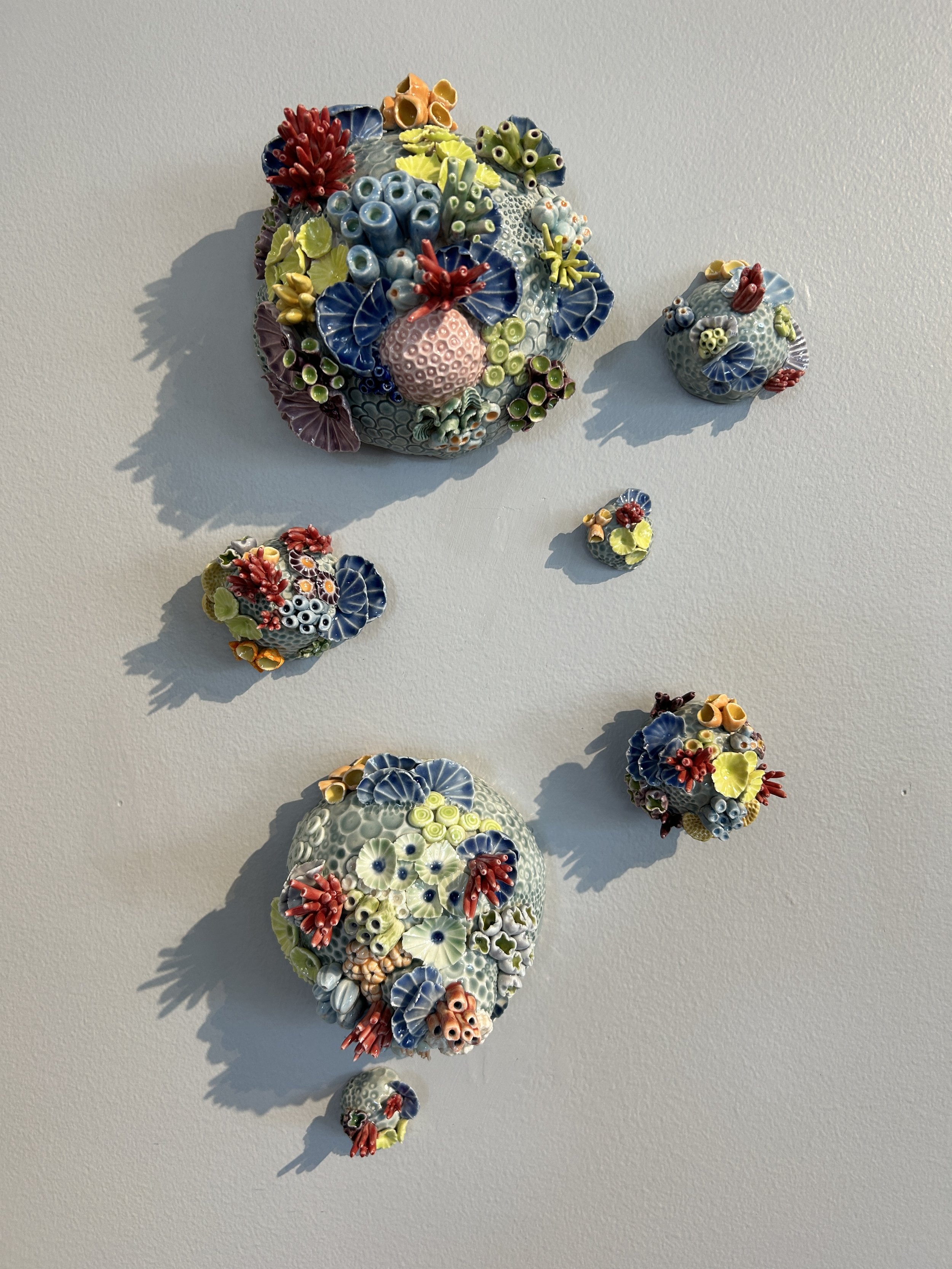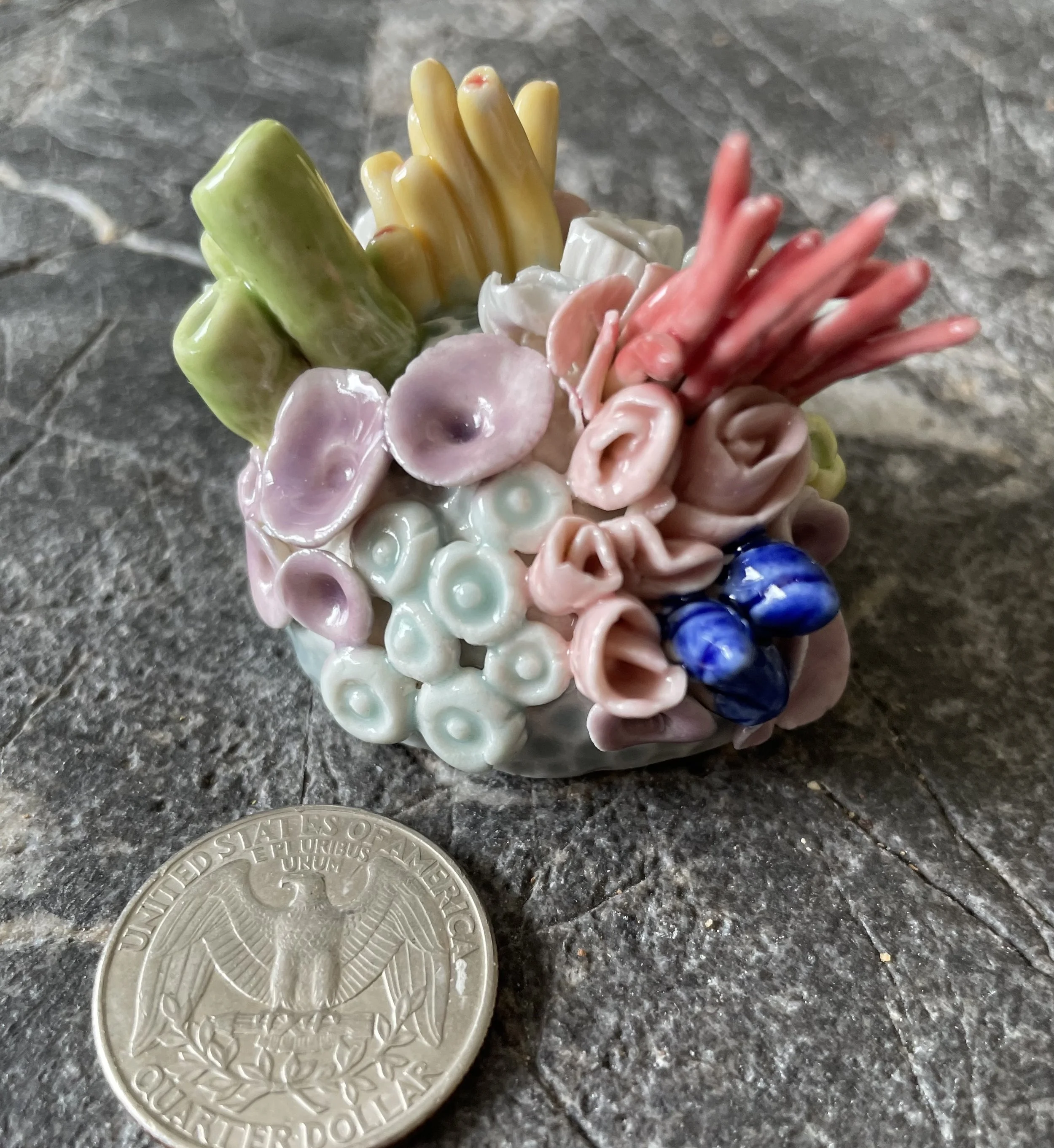 I learnt various techniques after taking a workshop with the queen of coral installations, Courtney Mattison when she had an exhibition at MOCA in 2016. I make teeny tiny porcelain corals only 1 inch to 14 inches in circumference and recently I have made them so that they can hang on the wall. Each piece has an initial firing, then hand glazed 3 times to highlight all the textures before its final firing. Occasionally, I will apply 22K gold and this is then fired a third time.